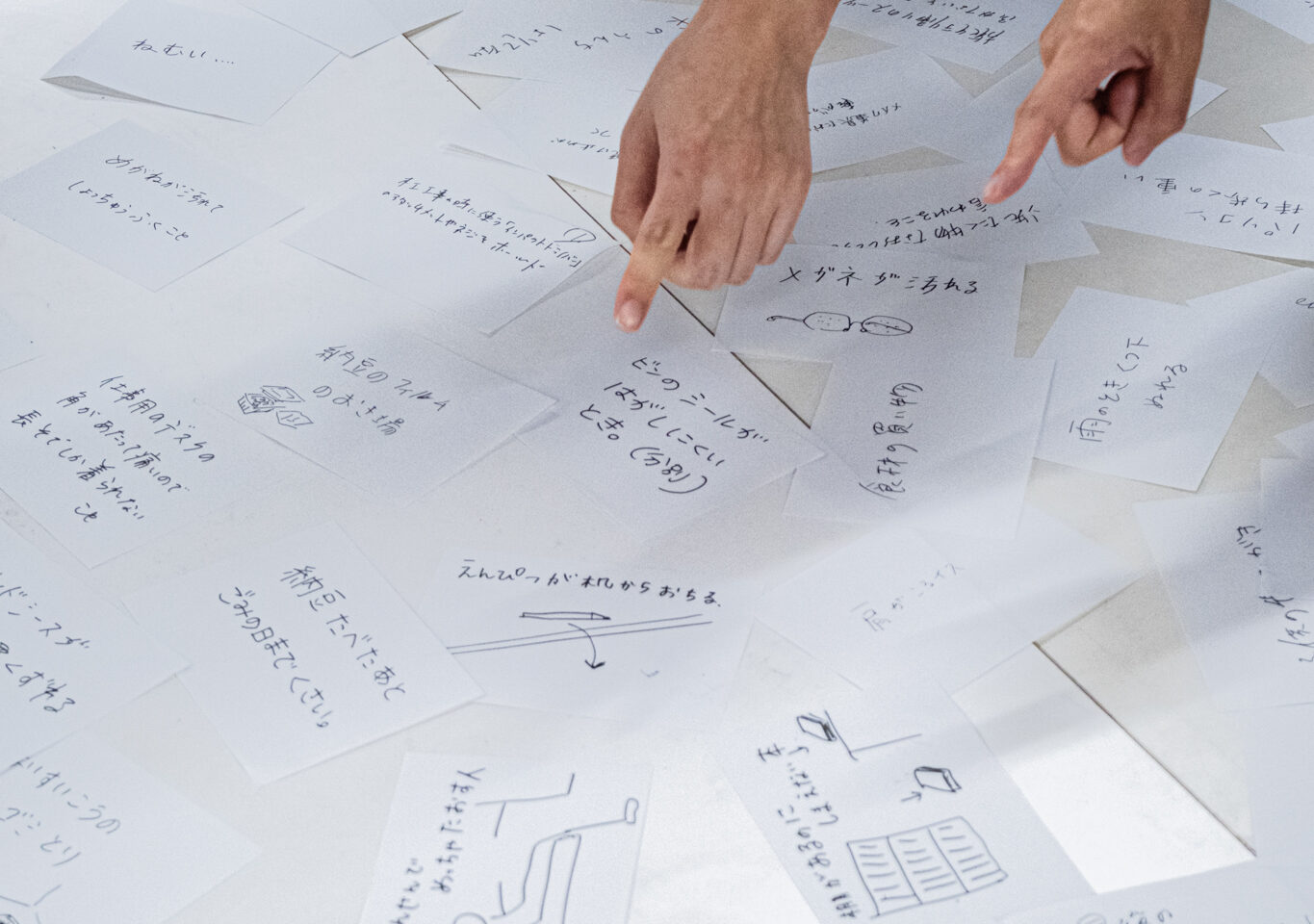 日常のモヤモヤをカードに書き出し、直感で選び、ひらめいた解決策を描き、最後は試作品をダンボールで作成。雑でもいい、下手でもいい、を合言葉にとにかく手を動かし続けました。