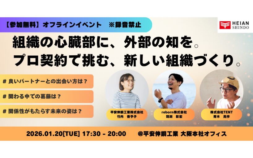 2026年1月20日(火) に、大阪本社オフィスにて、平安伸銅工業の歴史を追いながら組織づくりの軌跡を辿るオフラインのトークイベント『組織の心臓部に外部の知を。プロ契約で挑む、新しい組織づくり。』を開催します。