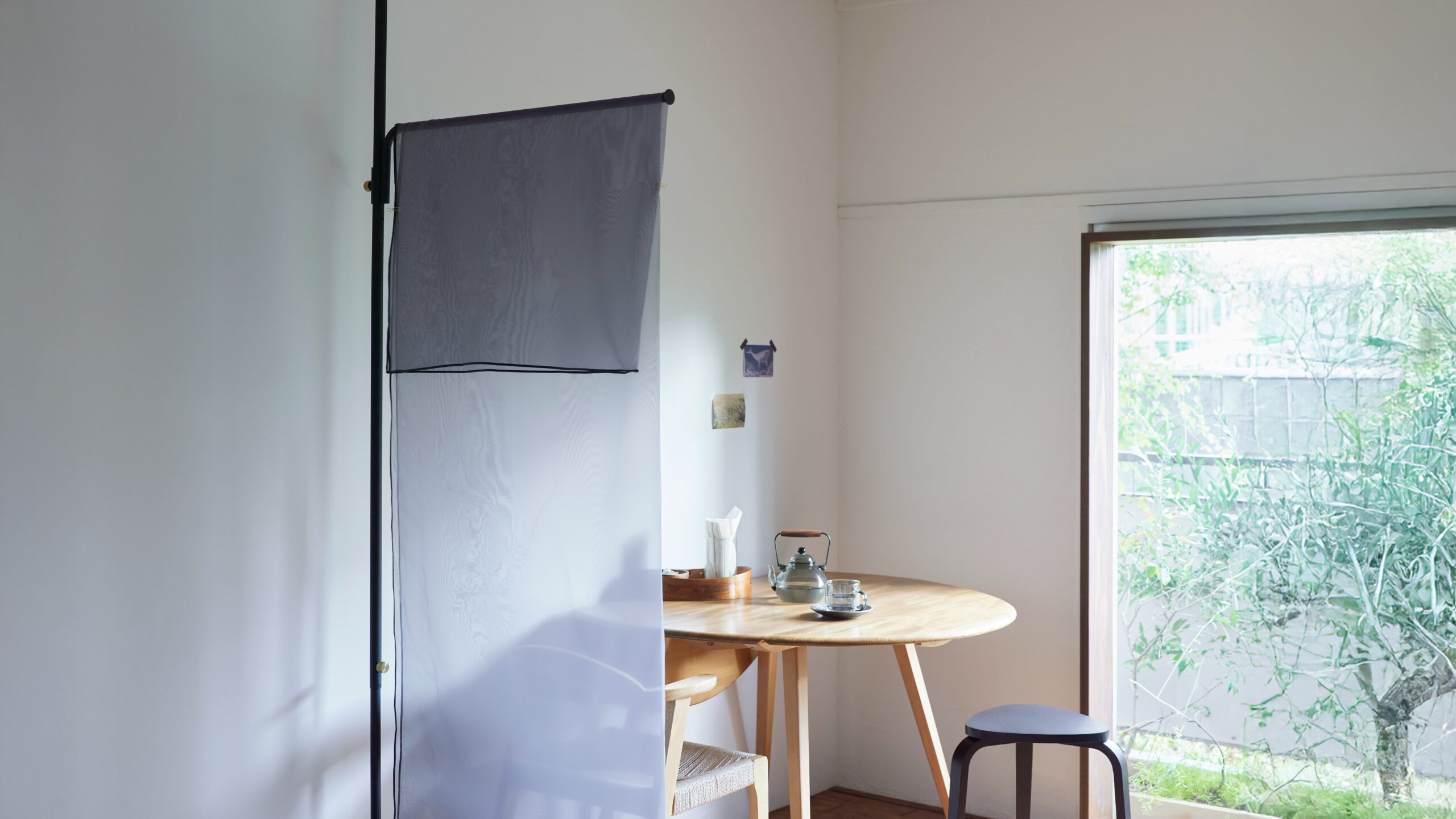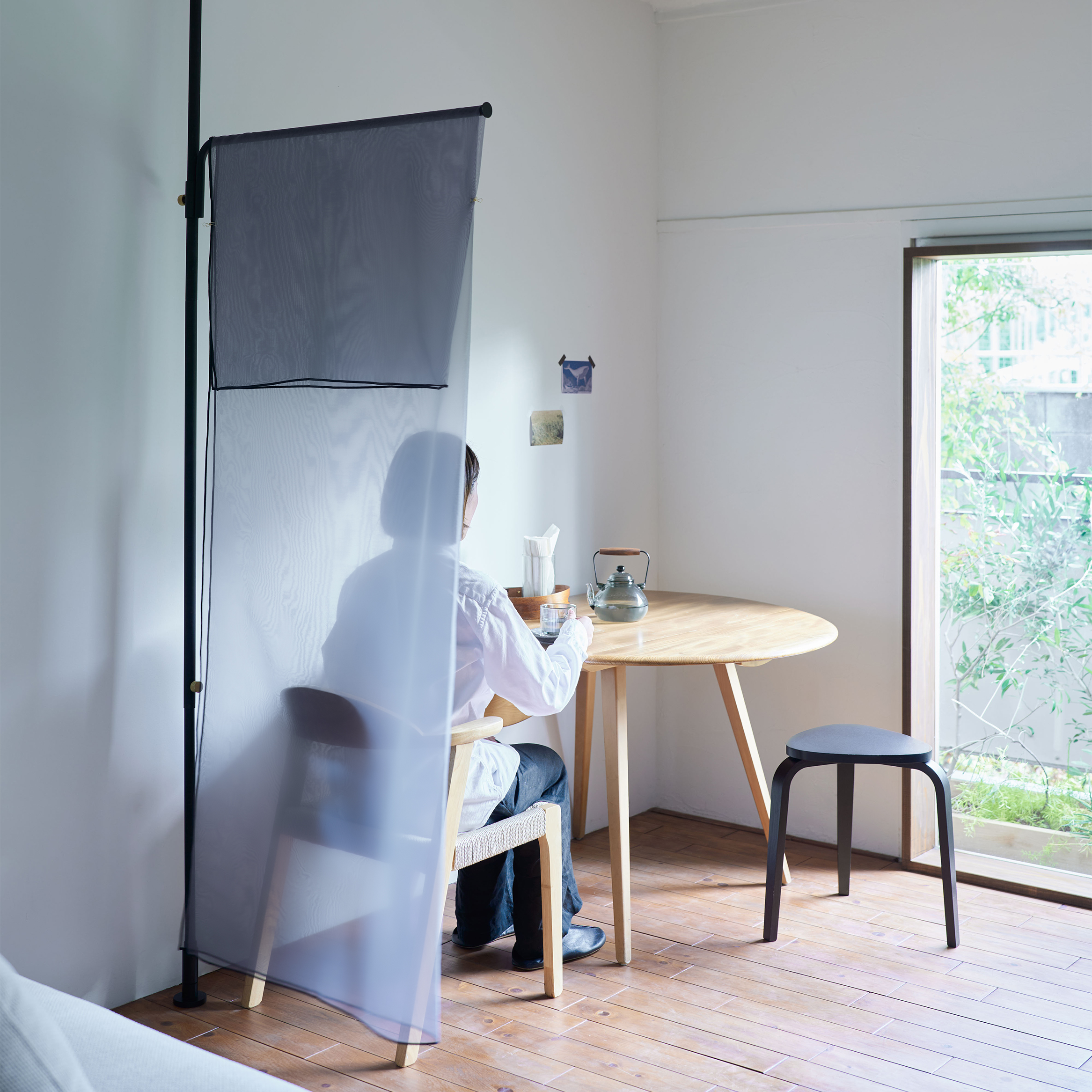 横幅約86.5cmのハンガーパイプが程よいサイズの間仕切りに。透け感のあるカーテンを活用すれば、人の気配を感じながらも、適度な距離をつくることができます。