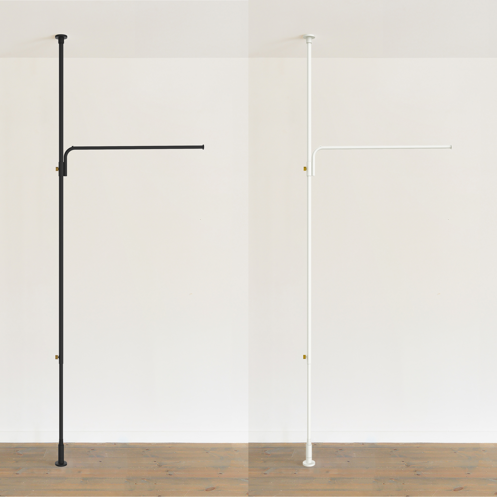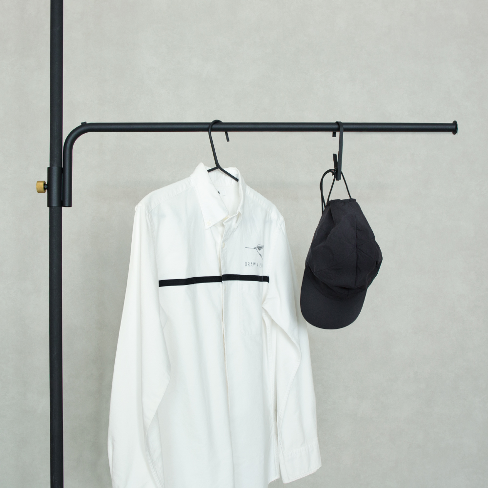 新商品の「Cloth Arm」は、縦方向に突っ張る「Tension Rod」と組み合わせることで、好きな場所にハンギングバーを設置できます。