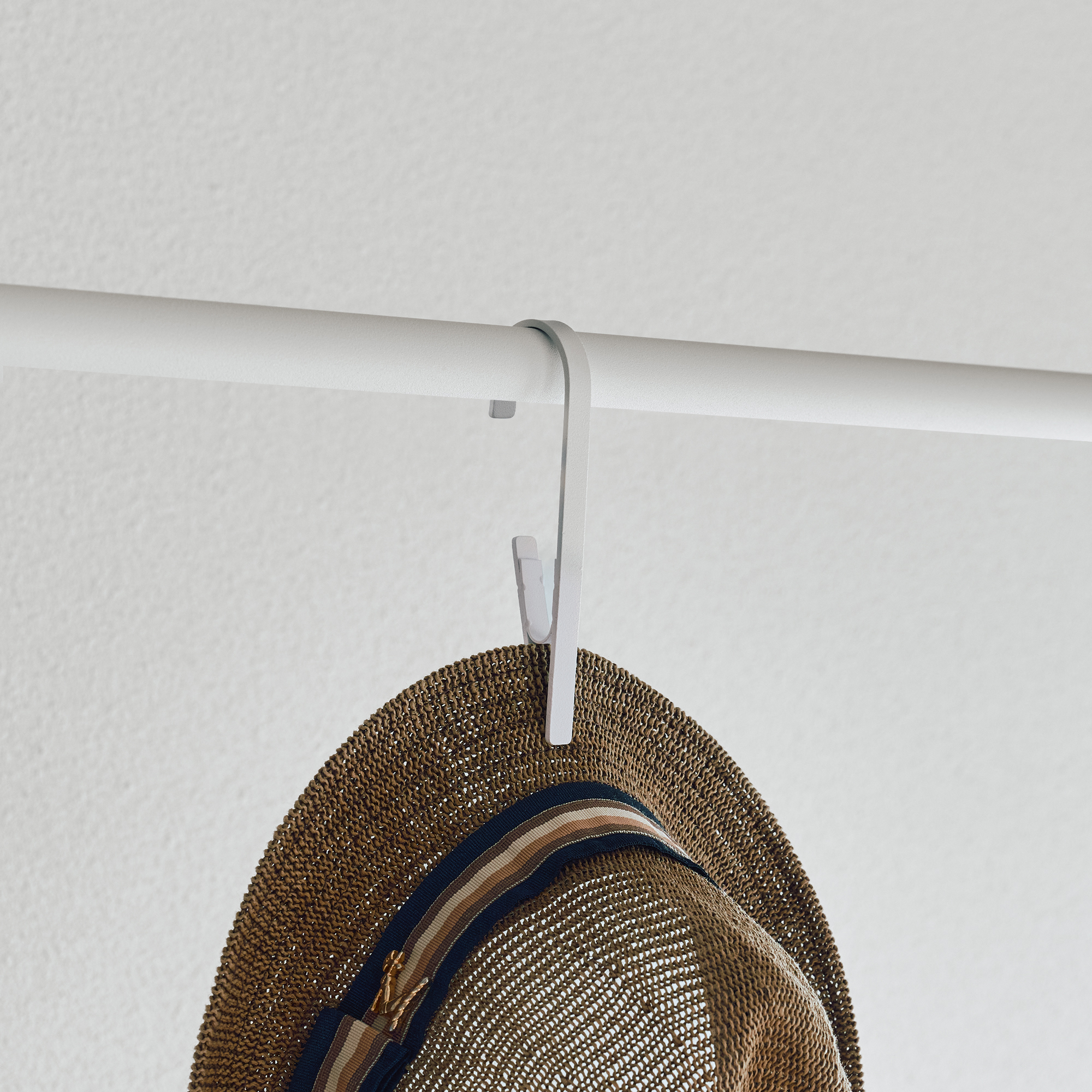 「Clip Hook」を使えば、ハンギング収納はもちろん、マルチクロスを挟んで掛けることで間仕切りにも使えます。