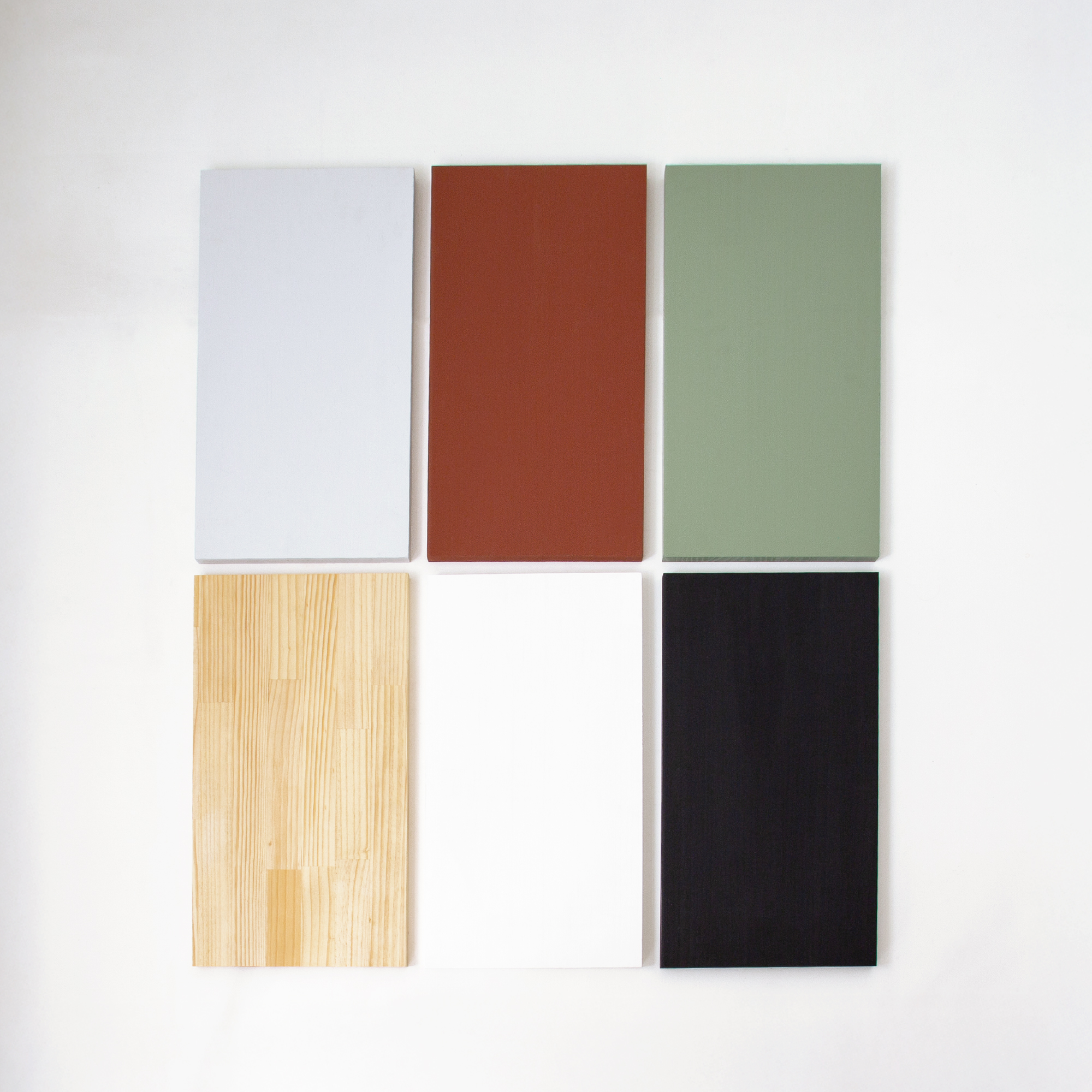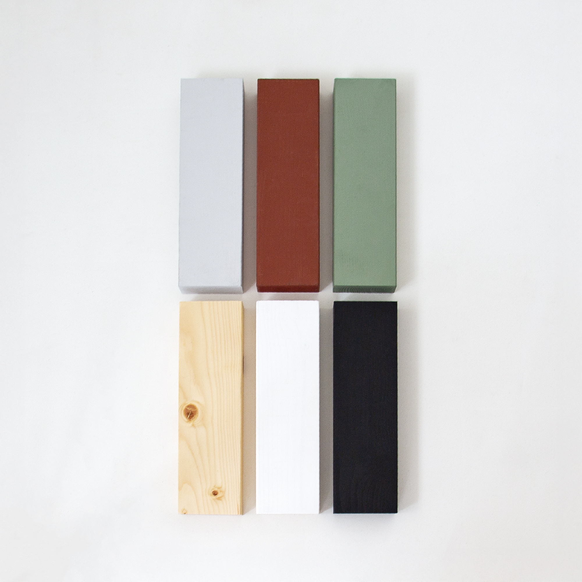 上段左からライトグレー、テラコッタ、ライトモス、オイル塗装、ホワイト、ブラック