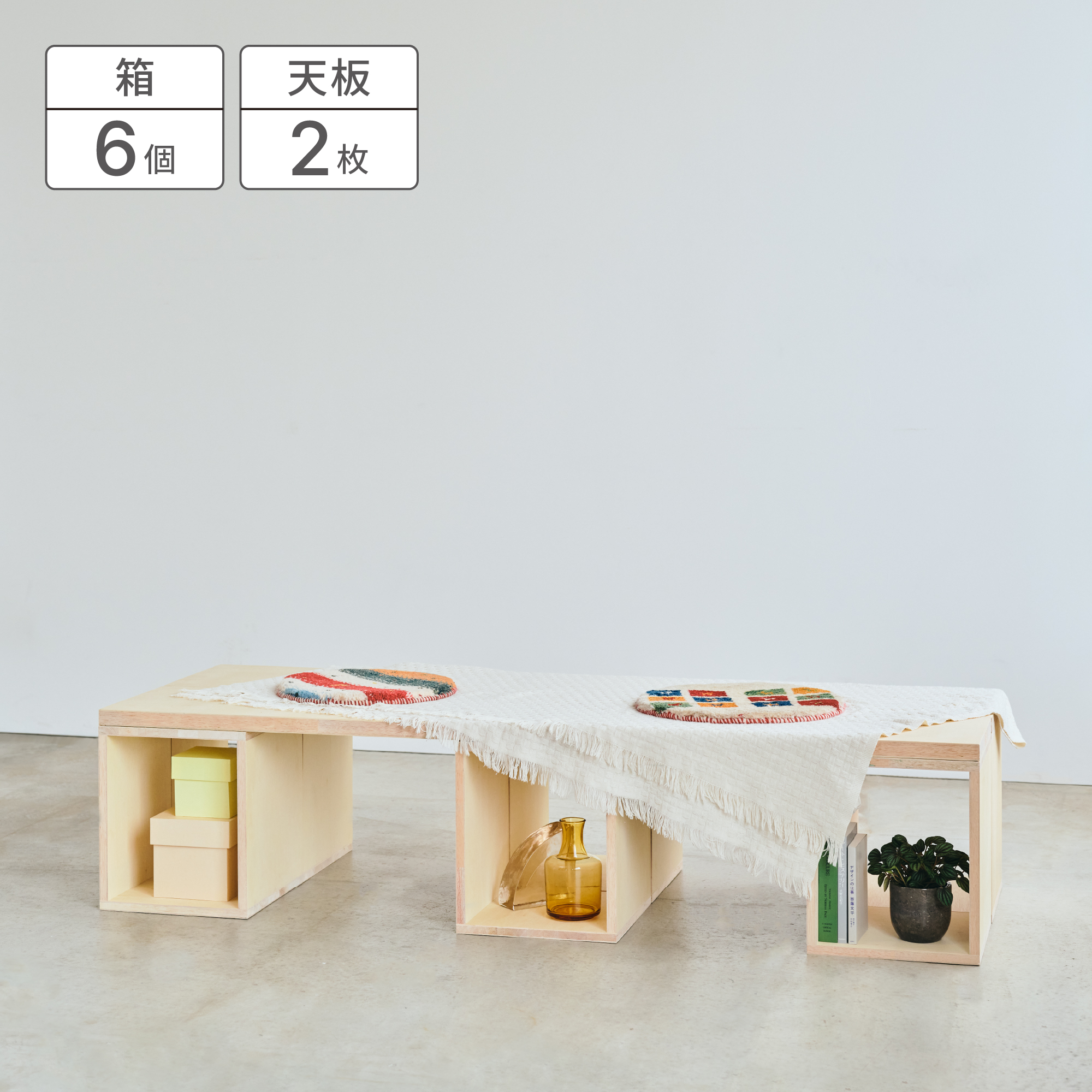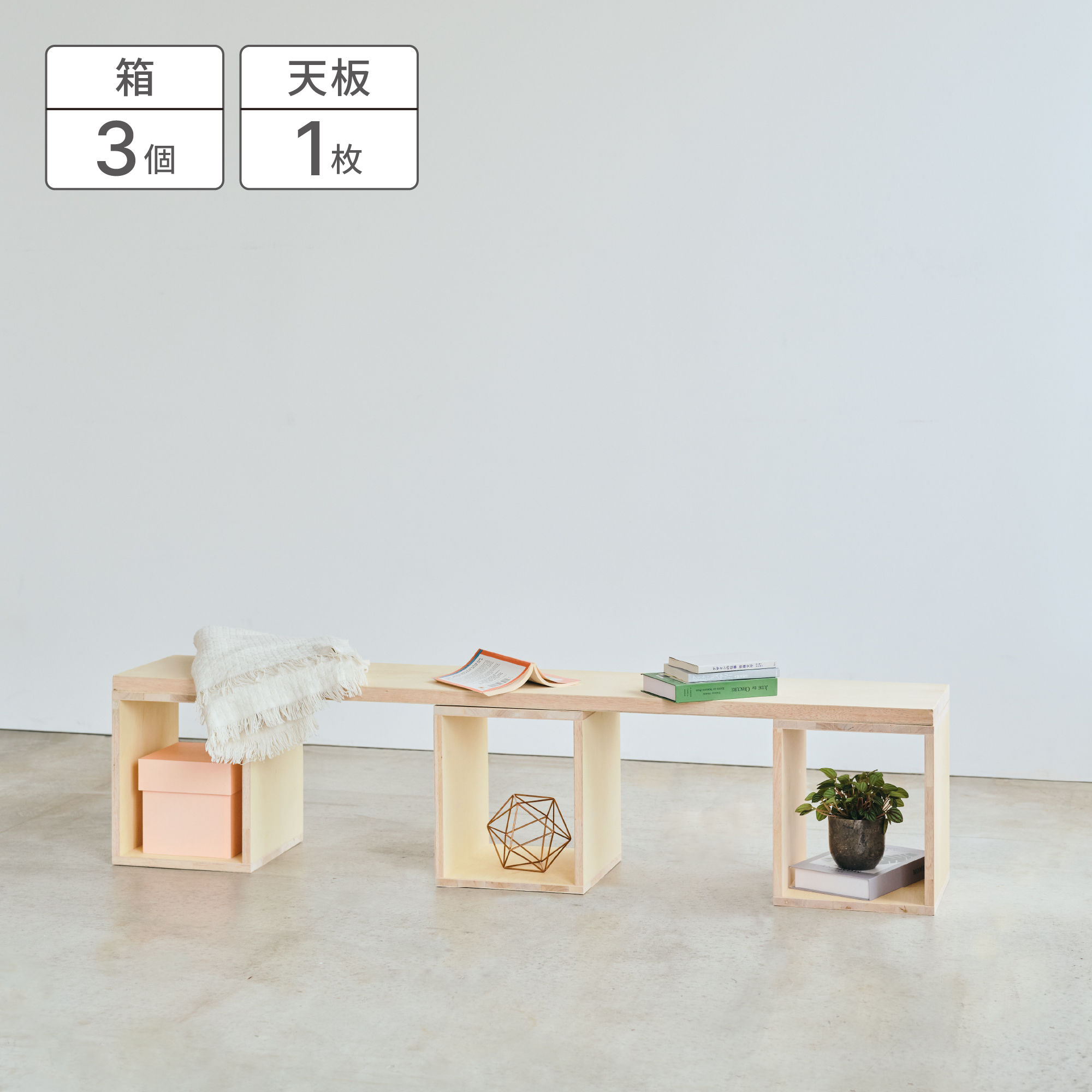 また、箱を3つ並べて専用の天板を組み合わせることで、ちょっとした腰掛けに最適な高さのベンチに。