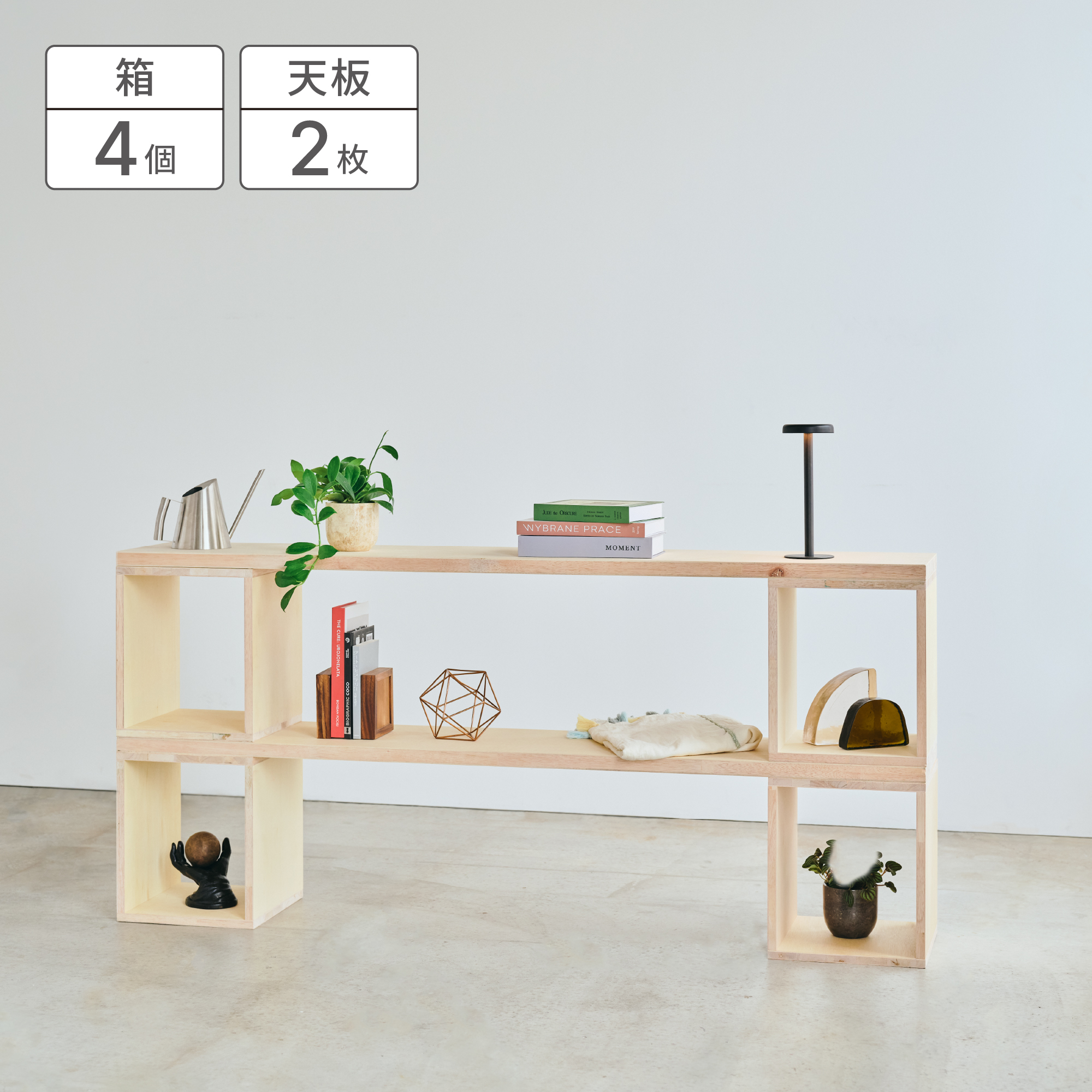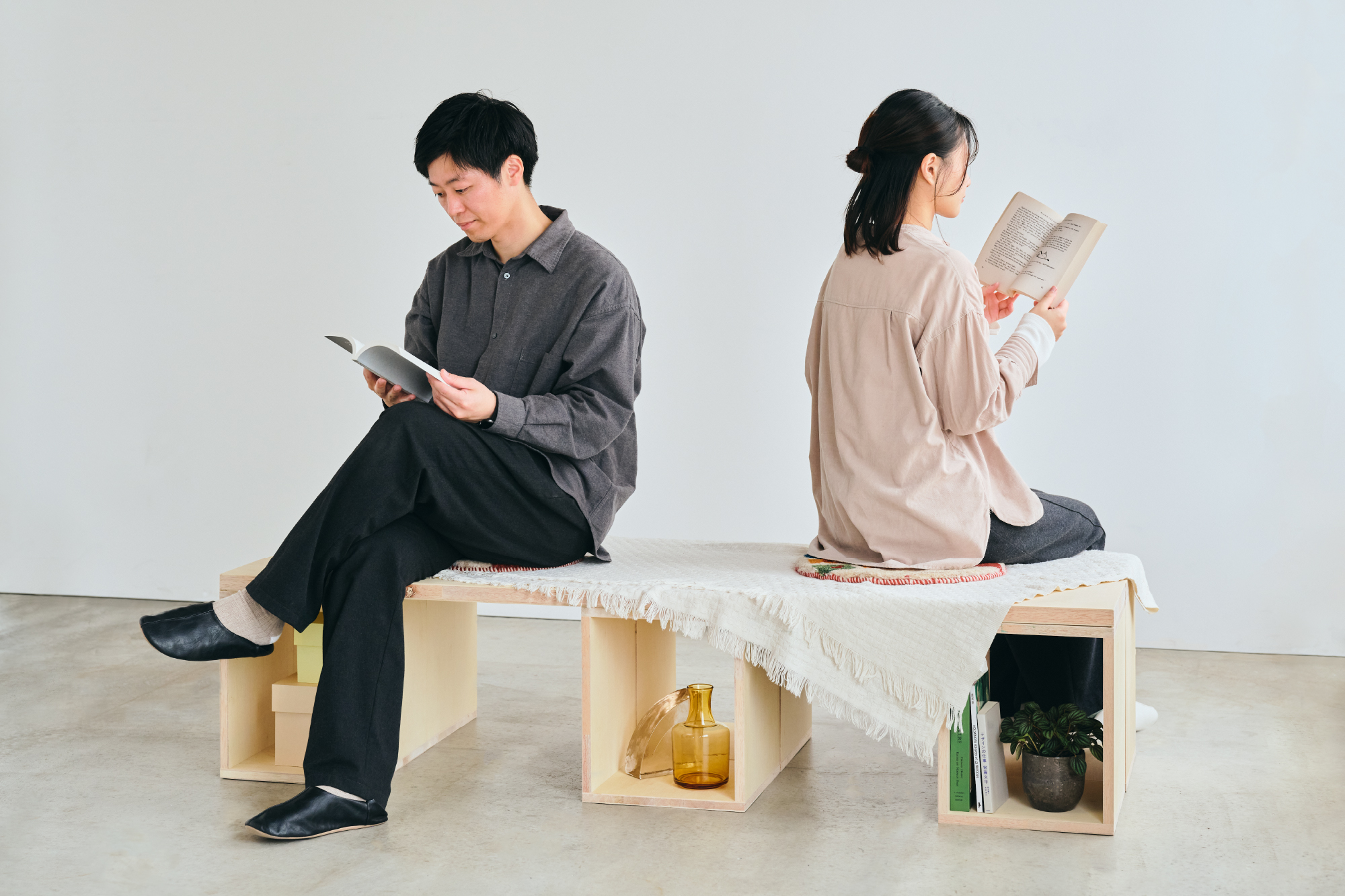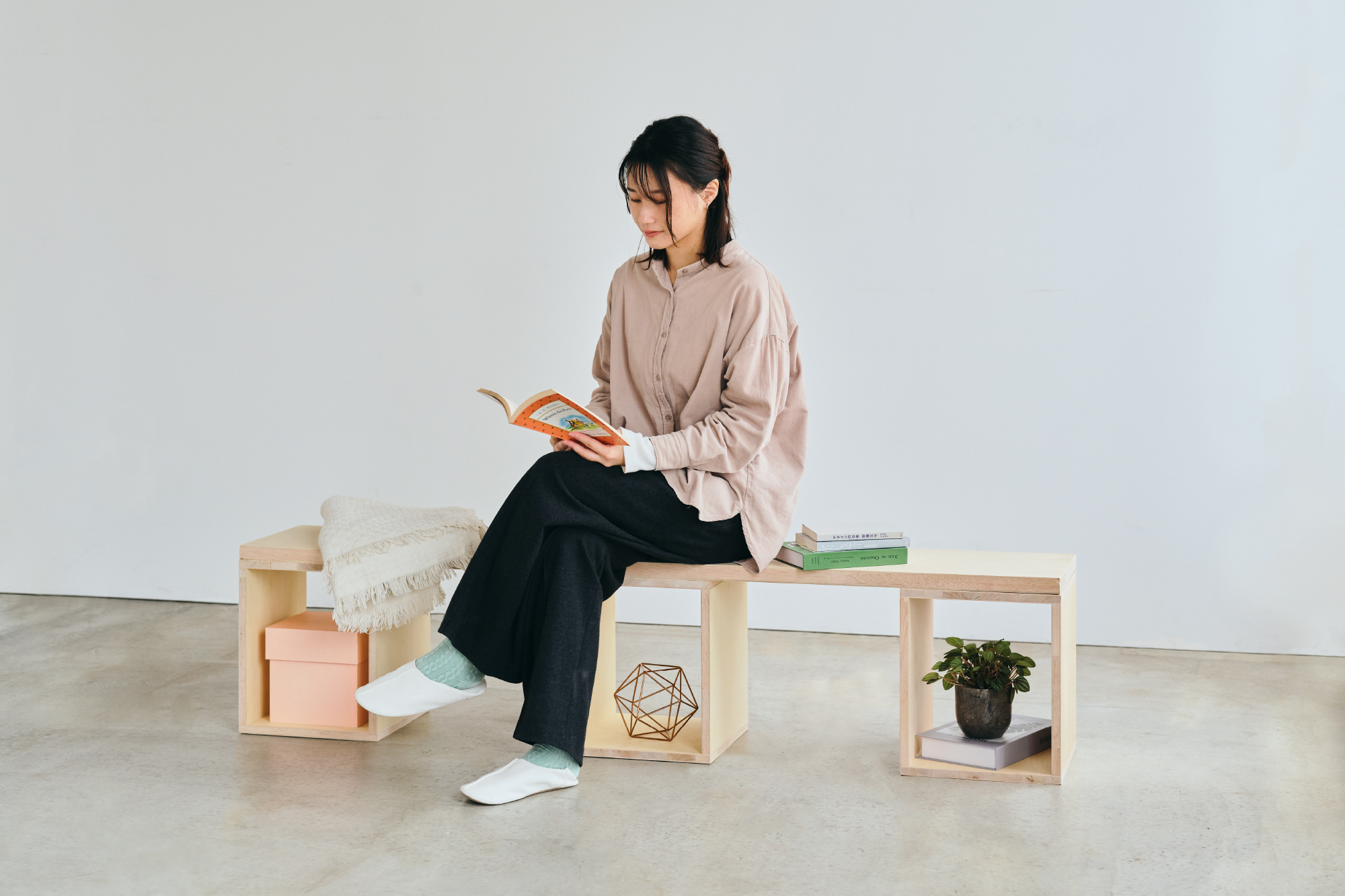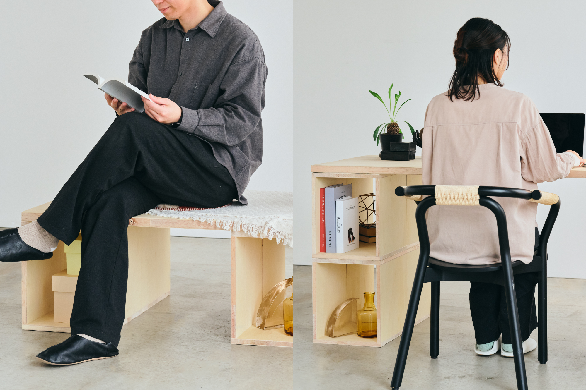 「つみハコ」は、たった一つの箱から、ベンチにも、棚にもデスクにも進化するモジュール家具です。 暮らしの変化に合わせて、積み木のように自由に組み替え、最適な形をいつでも見つけることができます。