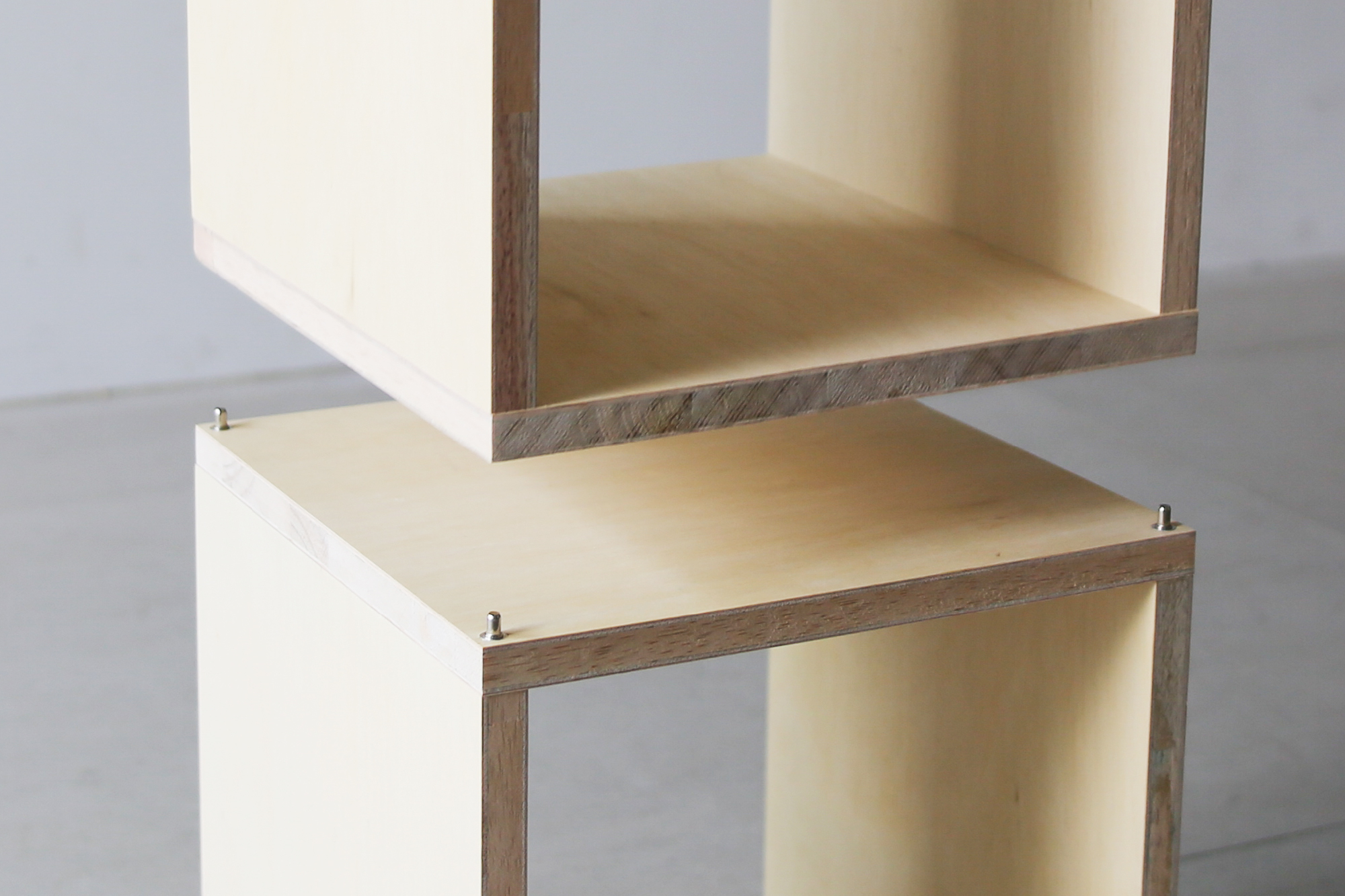 重ねた箱がズレないようダボを使って連結します。 ネジ留めしないので、組み替えも簡単。