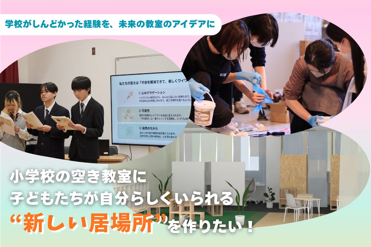 本プロジェクトでは、不登校などの経験を持つ飛鳥未来高等学校の生徒たちが、自身の経験を活かして、西船場小学校の空き教室に小学生のための“理想の居場所”をデザインしました。