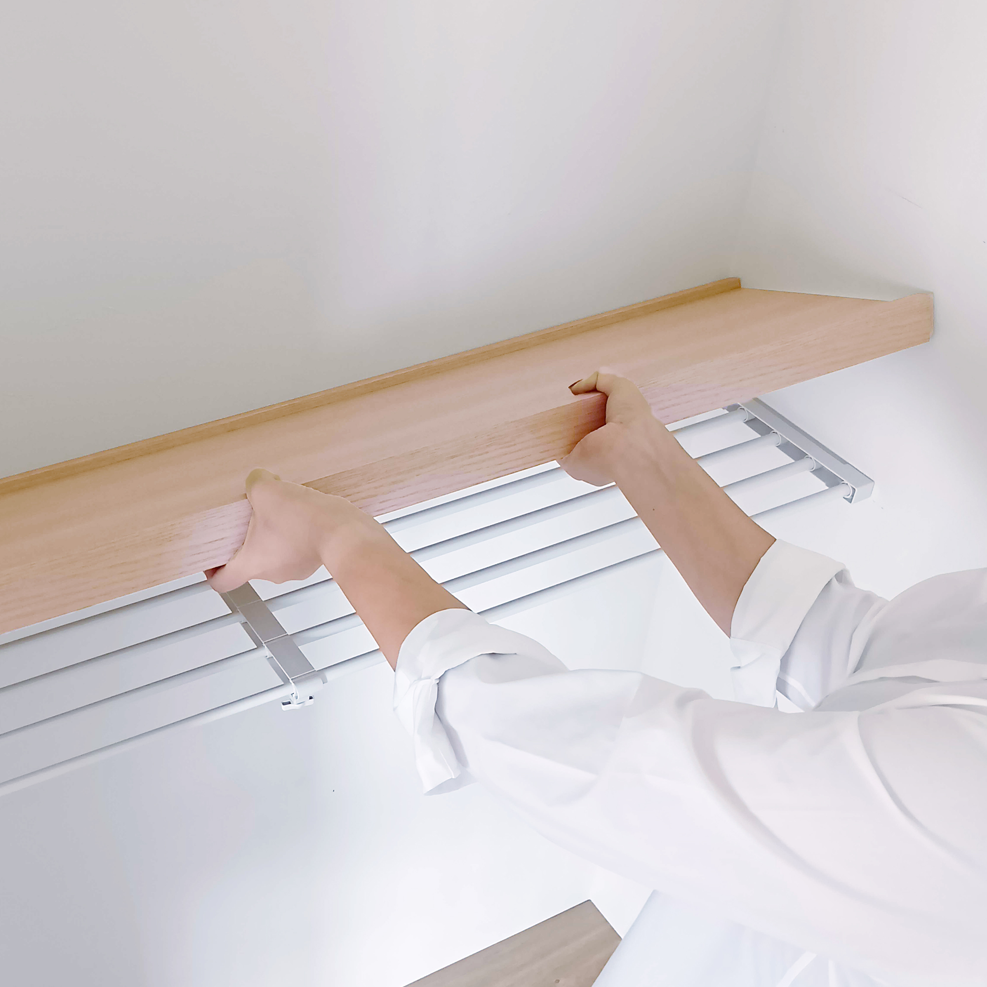 ネジや工具不要。突っ張り棚にそのまま載せるだけで、棚全体をナチュラルな木製棚に変え、段差のない見た目を実現します。
