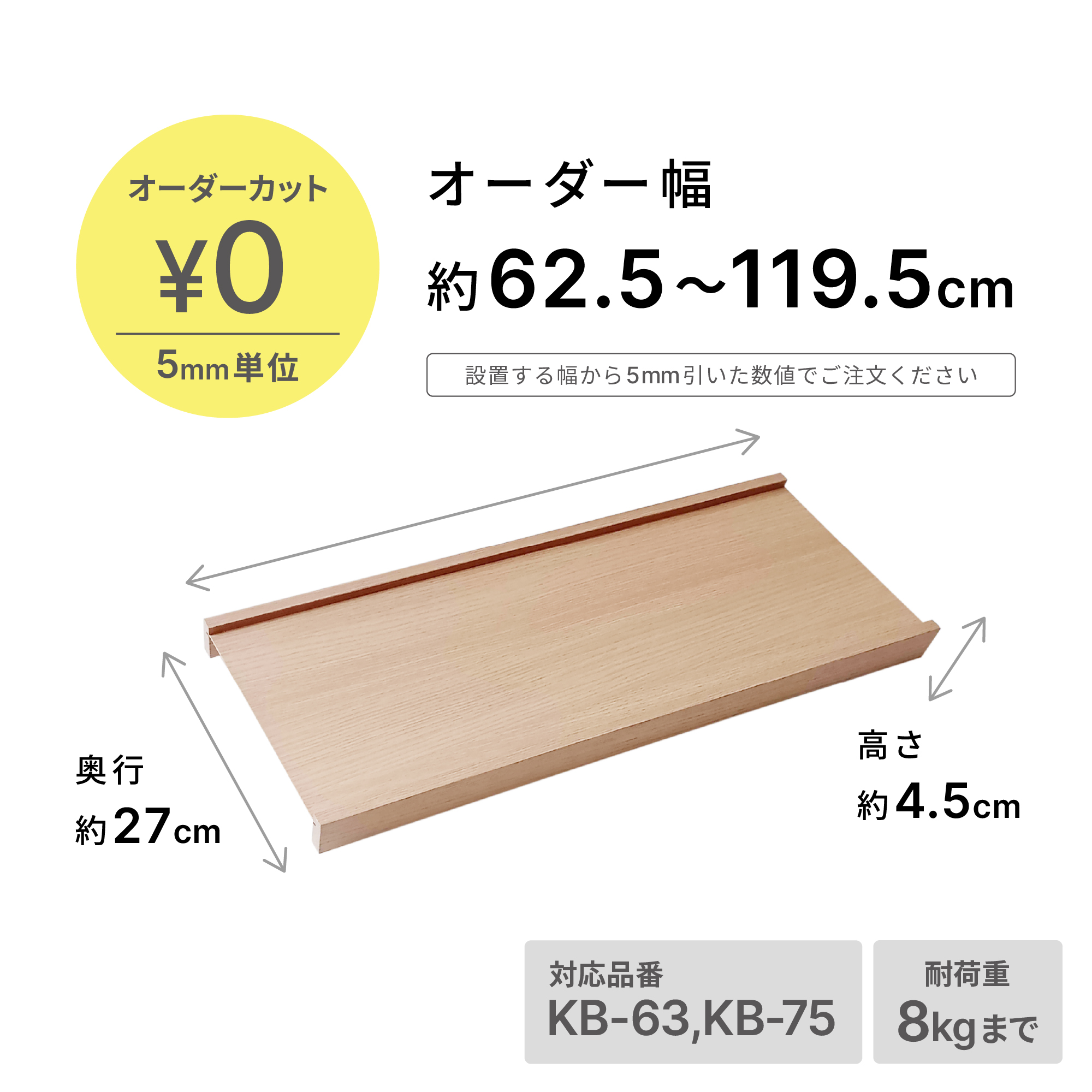 設置幅(63cm〜120cmの間)に合わせて、5mmピッチで希望サイズを選択可能。壁と棚の隙間を最小限に抑え、より造り付けのような一体感を実現します。