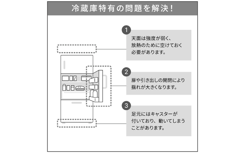※本製品は冷蔵庫本体を簡易固定することで、冷蔵庫の移動や転倒を防止する器具です。